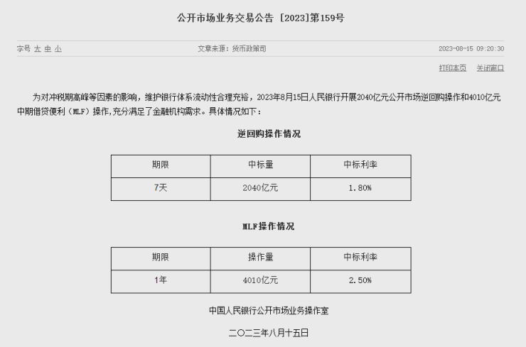 中国人民银行15日消息,为对冲税期高峰等因素的影响,维护银行体系流动性合理充裕,其当天开展4010亿元(人民币,下同)1年期MLF(中期借贷便利)和2040亿元7天期逆回购操作,中标利率分别为2.5%、1.80%,上次分别为2.65%、1.90%,此次分别下降15个和10个基点。
