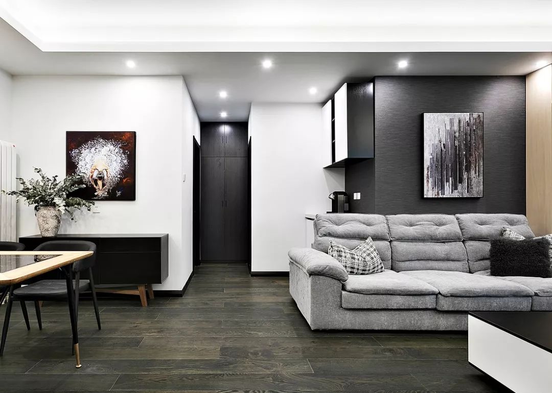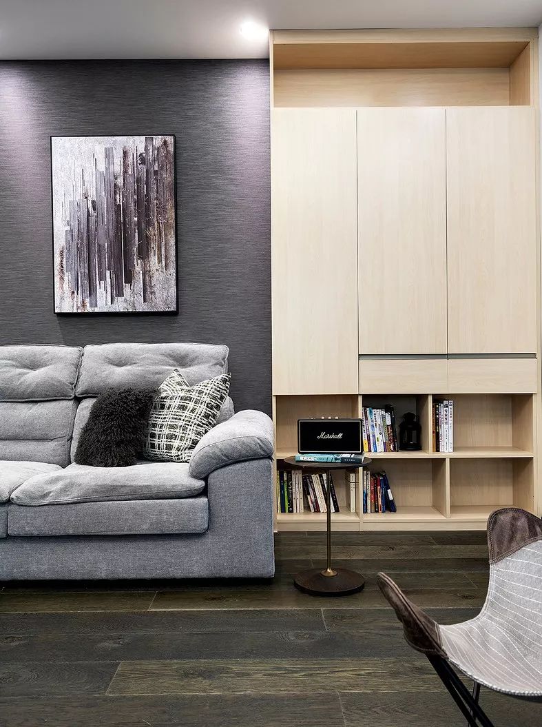 ▲ 黑白加原木色为主色调,沙发背景墙局部深灰,墙面层次对比增加空间感。