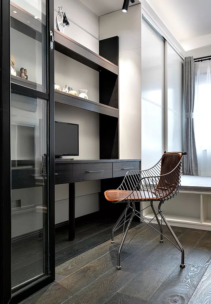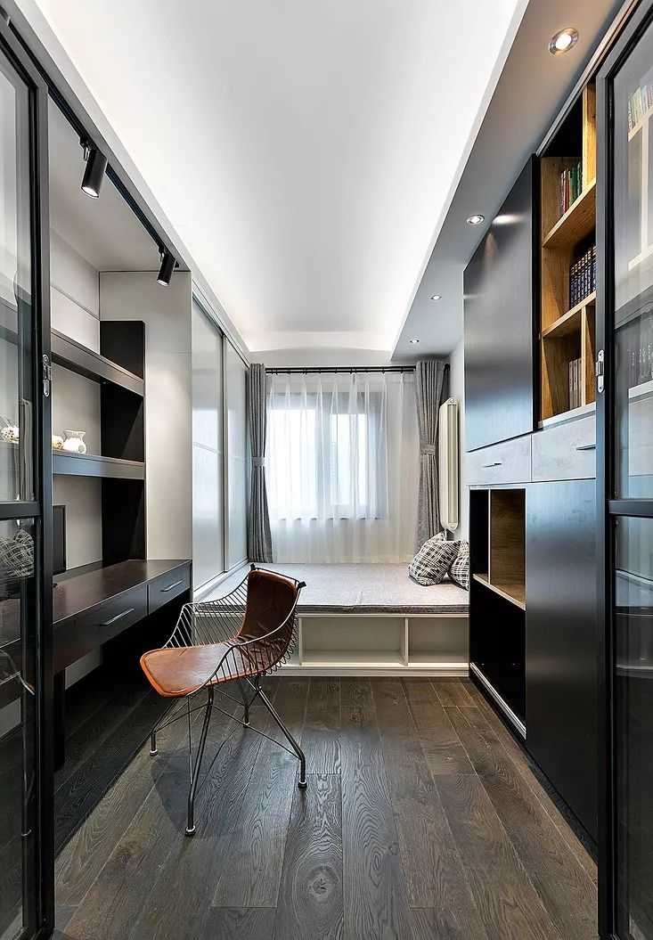 ▲ 黑色书架和棕色椅子,延续了空间整体的基调。