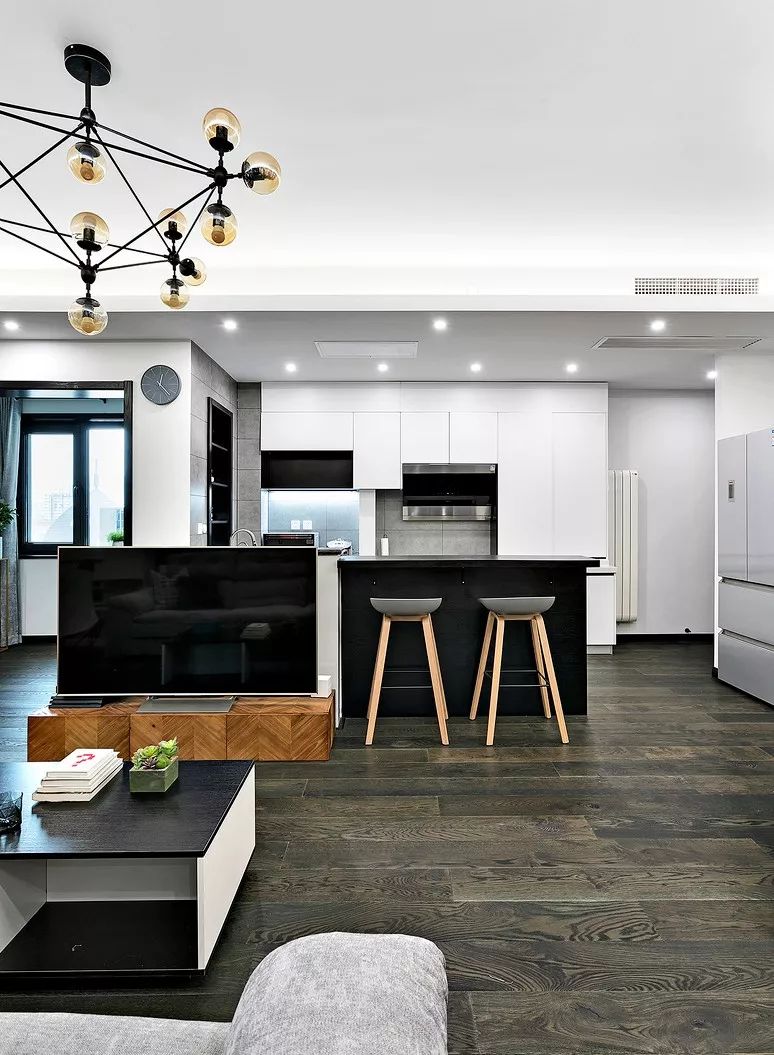 ▲ 利用电视墙和开放式厨房的关系,中岛、吧台、电视墙综合设计。