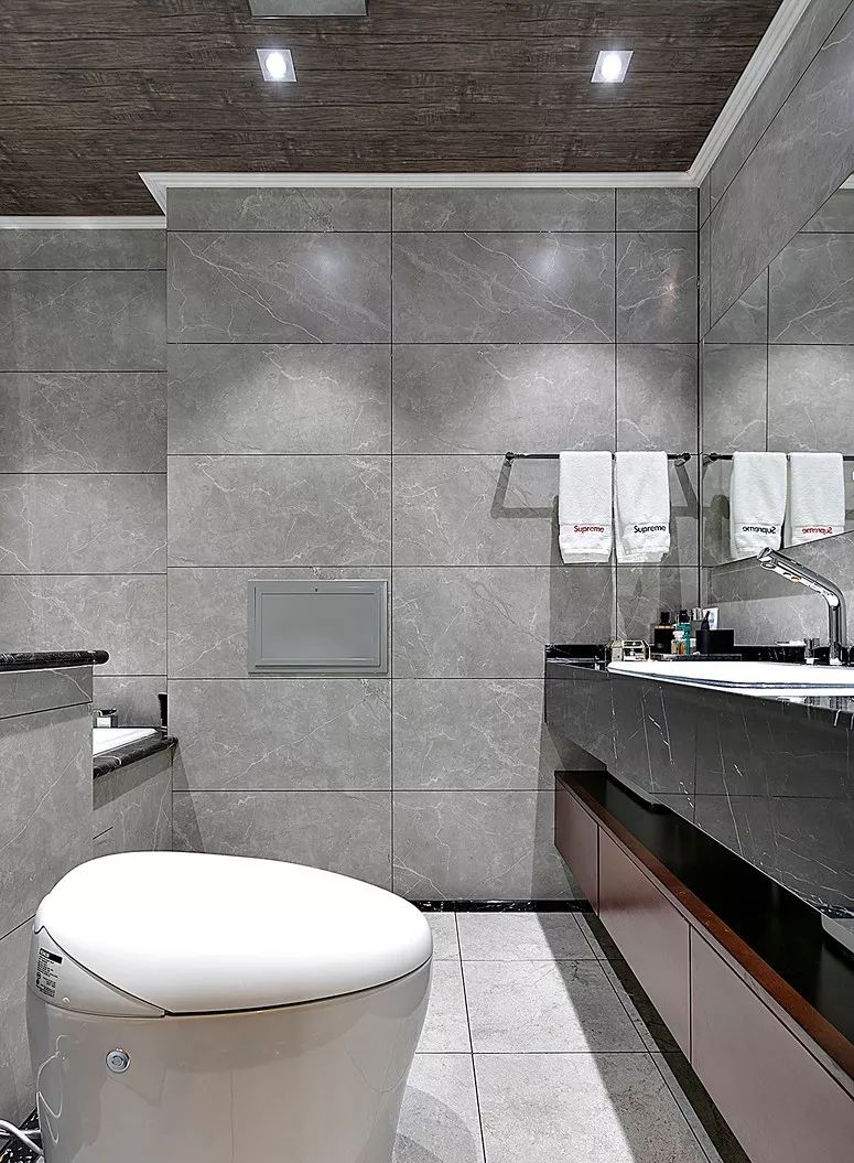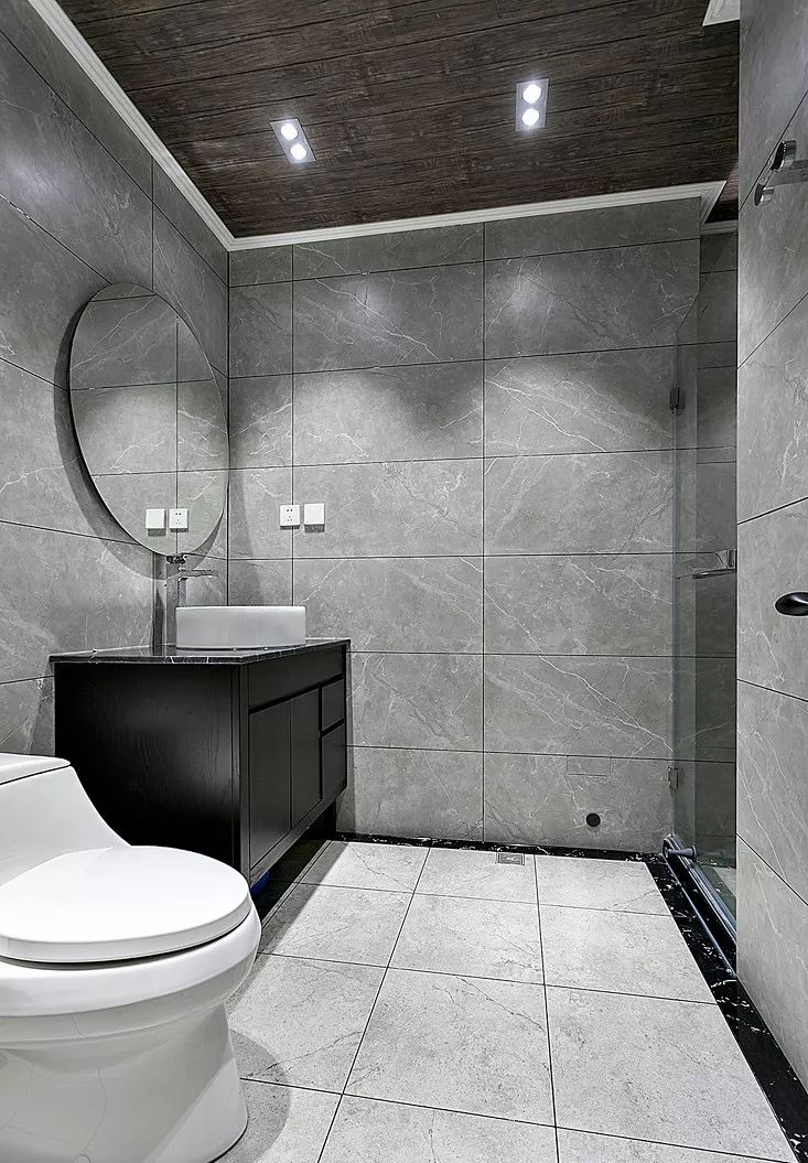 ▲ 卫生间使用水泥灰地砖,顶面是仿生态木的吊顶材料,延续工业感。利用一部分客厅面积实现浴缸。