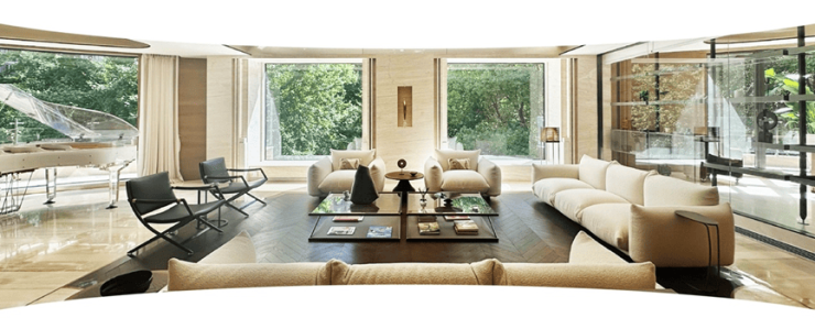 从上海第一座电梯私宅到古北寰幕第一座私梯平墅,古北寰幕奢阔客厅面积就达124 ㎡、进深12米,大气天成,全屋设施完善,拥有艺术走廊、起居室、餐厅、Chef‘s厨房、派对厨房、3D影院、巨大的图书墙、三角钢琴区、茶室、酒吧台、恒温酒窖,在使用功能上,满足了所有上流社会的社交场景需求。用大理石、洞石、玉石拼花、真丝墙纸、航空铝、顶级豪车木饰皮不计成本的装饰,顶奢全装全配,采用ARMANI CASA、Poliform、Agape、CHI WING LO等意大利、法国、德国近60个世界一线顶级品牌。