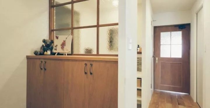 狭长的入户玄关也是房子里采光较弱的位置,利用内窗向客厅借光,晚上通过半透明隔断过滤出的光源,让人一进门就能感受到温馨的居家氛围。