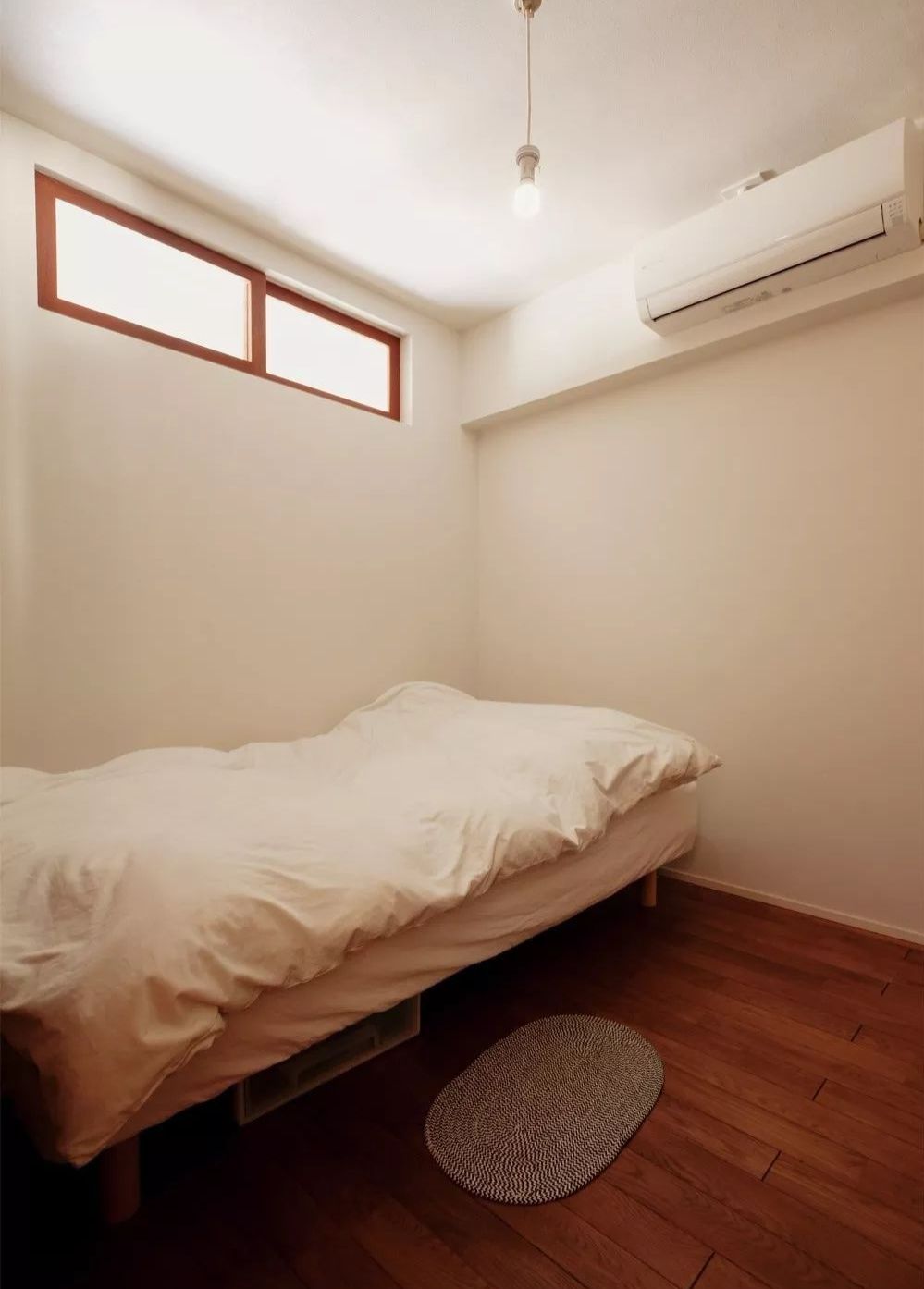作为通风的窗户只需要考虑横向的长度即可,将它安装在墙壁靠上的位置,能够保证卧室的私密性。