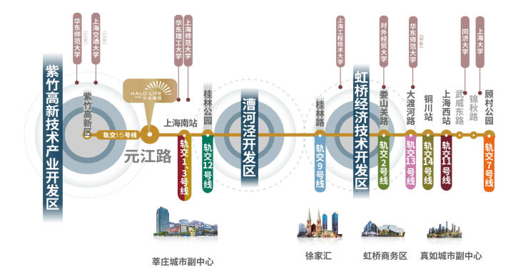 更为重要的是,作为上海“科技线”的15号线,连通紫竹高新开发区、漕河泾开发区、虹桥经济技术开发区3大国家级科创园区;连接上海交通大学闵行校区、华东师范大学闵行校区、华东理工大学徐汇校区、上海师范大学徐汇校区、同济大学沪西校区等9所TOD名校;贯穿长风公园、桂林公园、上海植物园、顾村公园4大公园,不仅串联全球都会的世界科创地标,更吸纳科创精英,悦享公园自由,成就城市黄金发展动脉。