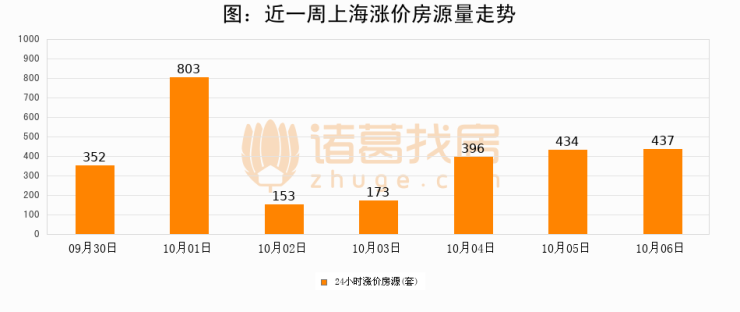 根据诸葛找房数据显示,上海24小时涨价房源量为437套,较10月05日增加3套,环比上涨0.7%。与此同时,涨价房源占比小幅扩大,业主信心有所提升。