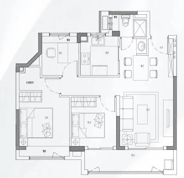 建面约89㎡B的户型做成了三房两厅,三开间朝南,其双开间阳台的面宽更是达到了5.5米。阳台的大空间可以规划为一个安放洗衣机、烘干机、小水槽的“家政工作区”, 也可以是阳光瑜伽室、客厅后花园、自然阅读室等,空间场景灵动切换。值得一提的是约89㎡所有户型主卧套房+1灵动空间的预留非常巧妙,可按需设计成独立衣帽间或0.5卫,这一切都实现了空间效能较大化。