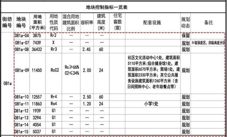 教育配套方面,原081a-05地块小学用地调整至新081a-11地块,地块更为规整,用地面积约1.19公顷,容积率1.2,限高24米。