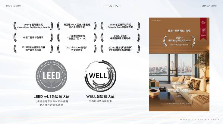 更重要的是那些“看不见的地方”。作为亚洲首个LEED与WELL双金认证住宅,项目从空气、水、光、热舒适等维度,构建起一套完整的健康生活系统。此外,项目还荣获FX英国室内设计大奖等国际殊荣,成为真正意义上的“国际奖项大满贯”作品。
