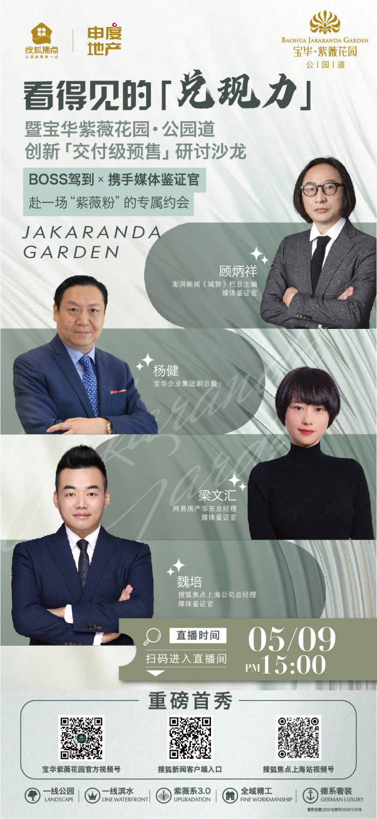 本次活动由搜狐焦点网和新媒体矩阵《地产申度》联合出品,力邀宝华企业集团副总裁杨健现身解读,贡献个人荧屏直播首秀;同时,澎湃新闻《城势》栏目主编顾炳祥、网易房产华东区总经理梁文汇、搜狐焦点上海公司总经理魏培组成媒体观察团,实地探访宝华紫薇花园·公园道,并分享参观体验之后的感想,共同探讨宝华紫薇花园·公园道「交付级预售」背后的故事及意义。