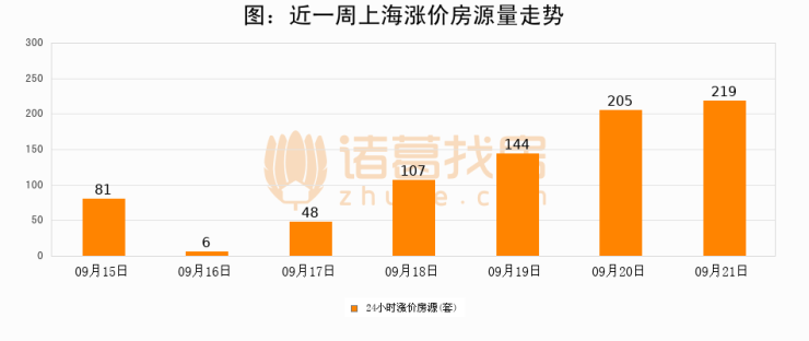 根据诸葛找房数据显示,上海24小时涨价房源量为219套,较09月20日增加14套,环比上涨6.8%。与此同时,涨价房源占比小幅扩大,业主信心有所提升。