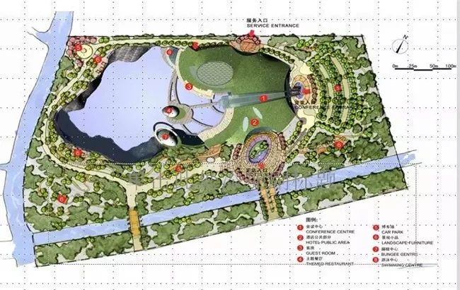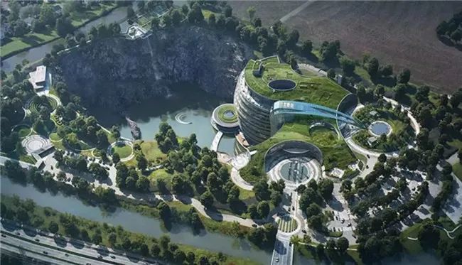 在整体建筑形态上,有三个非常主要的元素。排名前列是 Green Hill (绿色山丘),为什么“深坑酒店”后来被誉为“世界上海拔较低的高层”,也是和这个绿色山丘有关联的。世茂集团拿下的这个废坑,承载这许多的历史意义,加上佘山的地形地貌特征,这里的建筑限高仅为20米。所有的主要客房放在坑内,坑上主要为公共区域,即是绿色山丘下覆盖的部分,这也是这个建筑算入建筑高度的部分。这个绿色山丘在形态上呼应了周边的佘山自然风貌和英格兰山丘,同时也是建筑设计手法中的“绿色屋面”,正是节能环保的重要举措之一。