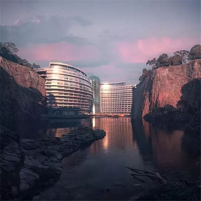 Martin Jochman马丁·约克曼 笔下呈现的“深坑酒店”和自然坑体完全相辅相成,仿佛是长在崖壁上。另外,他巧妙的结合了中国传统“太极”中阴阳的图形和概念,在酒店的左翼和右翼采用了非对称的平面组合,形成“S”状。采用每两层平面变化形成整体建筑三维的巧妙变化。这个设计概念从始到终的贯穿了整个酒店的设计,也非常自然不造作的形成了“世茂深坑酒店”的独特形态。