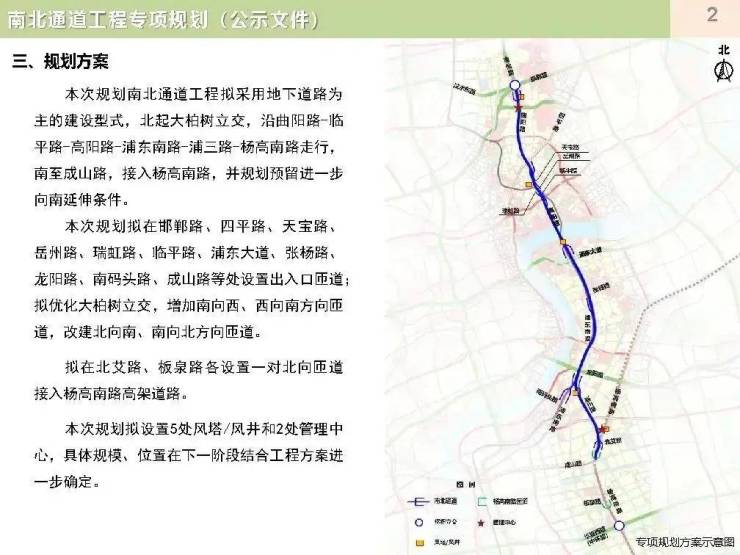 根据公示信息,南北通道浦西段和越江段工程北起中环大柏树立交,南至浦东大道,采用“双向4车道+两侧多功能车道”设计,为小客车专用通道,设计时速60公里,贯穿虹口、杨浦、浦东等多个区域,涉及欧阳路、曲阳路、北外滩、陆家嘴等七个街道。