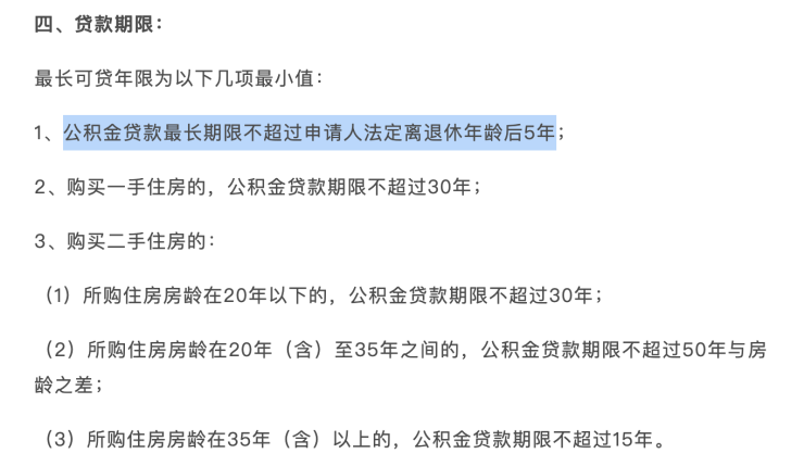 1、公积金贷款最长期限不超过申请人法定离退休年龄后5年;