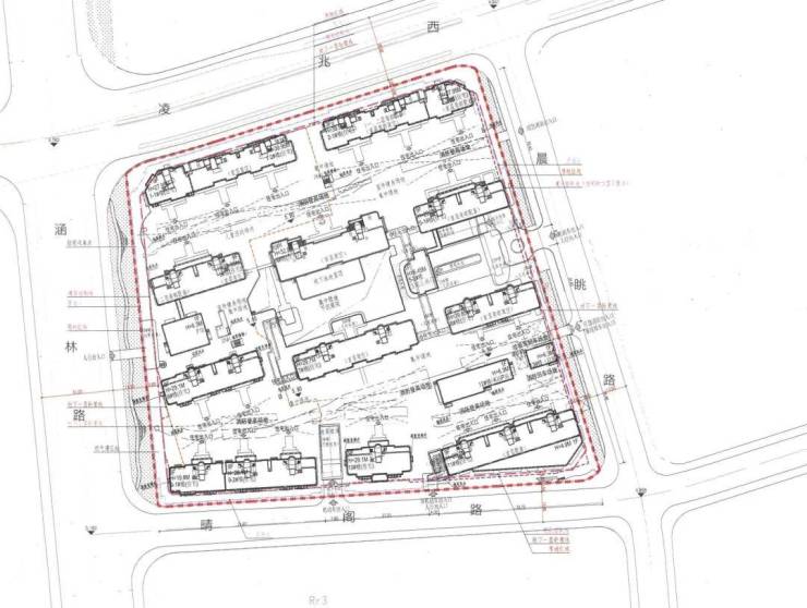 更致命的是规划布局。地块呈狭长形,整体朝向为西偏南约45°,而非大众更喜欢的正南正北。项目采用围合式布局,住宅与商业混合分布,楼栋高度参差不齐,三个地块分别规划了不同层数的住宅和商业建筑,总计约547套住宅。