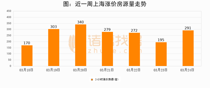 根据诸葛找房数据显示,上海24小时涨价房源量为291套,较03月23日增加96套,环比上涨49.2%。与此同时,涨价房源占比小幅扩大,业主信心有所提升。