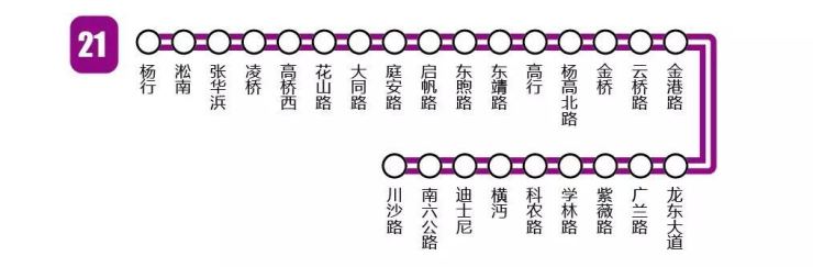 21号线北起杨行枢纽,南至城市副中心规划中沪通铁路东站枢纽,贯穿上海自贸区的各主要片区,以及上海迪士尼国际度假区。