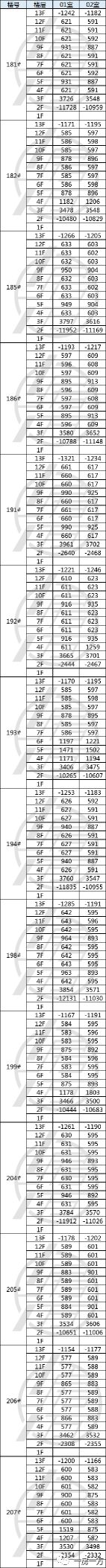 *表中数值为相邻两楼层的单价价差,例如181#1301室比181#1201室单价低1242元/㎡