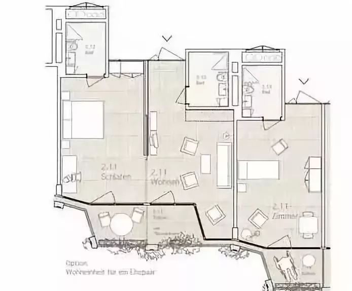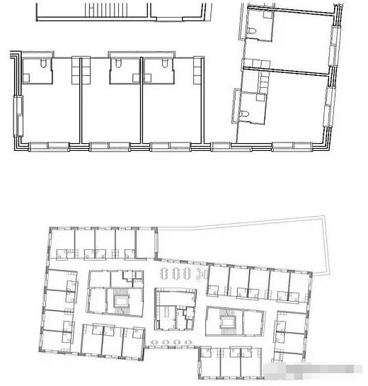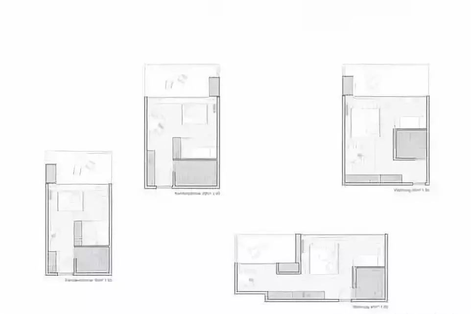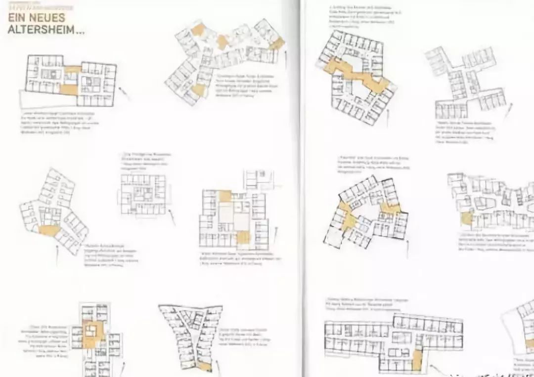 在瑞士这10年的平面探索中,最开始以Hotel(旅店)和Spital(医院)的平面作为出发点。平面发展的驱动力来自与老年人的交流需求。慢慢的,在设计评价中出现了一个Wohngruppe(居住组团)的概念,即“居住单元”与“公共交流空间”的组合。