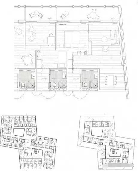 瑞士老年公寓的设计,仅有的规律一个是走廊式布局,可以增加交流。但其前提是暗厨房,但新出现的一些“走廊和房间”分开布置的案例解决了这个问题。