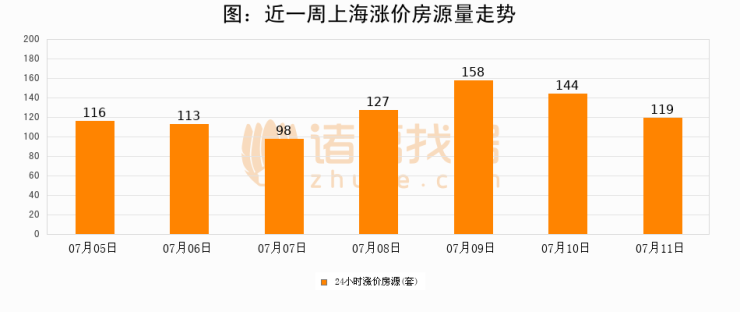 根据诸葛找房数据显示,上海24小时涨价房源量为119套,较07月10日减少25套,环比下降17.4%。与此同时,涨价房源占比小幅回落,对于购房者来说是一个入市窗口期,购房者可抓住时机入市。