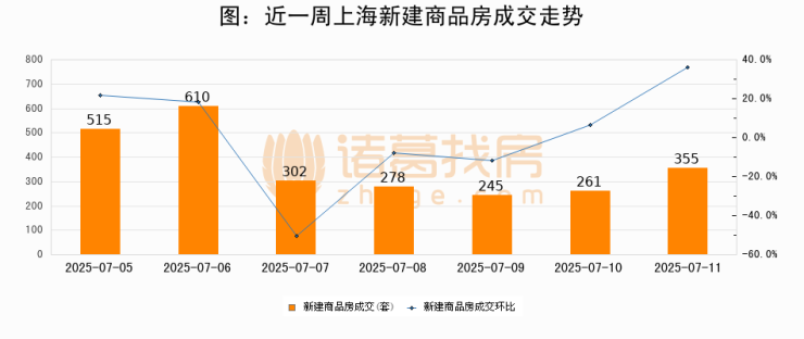 根据上海市房地产交易中心数据显示,2025年07月11日上海新建商品房成交355套,较昨日增加94套,环比上涨36%