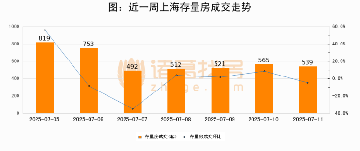 从存量房来看,2025年07月11日上海存量房单日成交539套,比昨日减少26套,环比下降4.6%。从近一周存量房成交来看,上海存量房日均成交套数为600套,07月11日单日成交539套,低于近一周平均水平10.2%。