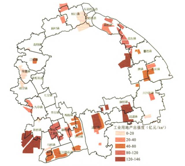 与此同时,城镇化的快速发展并未带来显著的经济效益,边缘地区的104产业区块中,较多园区的地均产出低于全市产业基地平均水平70亿元/平方公里,104产业区块以外还存在大量的195、198工业用地。