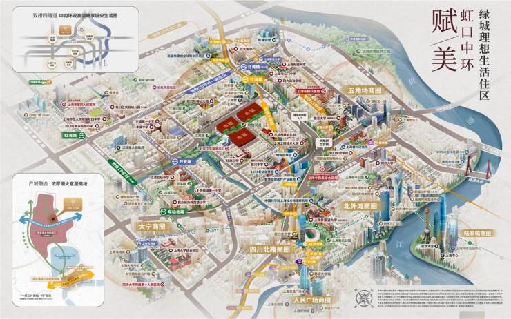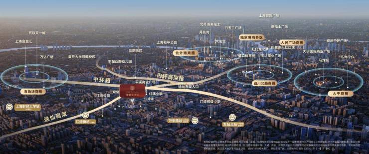 项目位于虹口江湾黄金地段,距中环直线距离仅约1.2km,离内环仅约1.7km,称得上是离内环至近的中环。项目周边更有逸仙路/中环/内环/南北高架4大高架环绕,日常开车随心可通城市各核芯商圈。