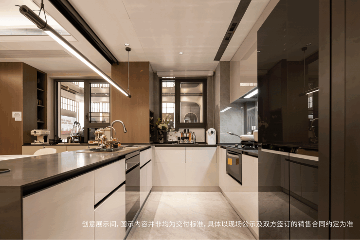 厨房依然是目前最经典的开放式U型设计,同步兼顾了实用和美观度。全隐升降式油烟机、灶蒸烤一体机、约15套的洗碗机、自带洗杯器的多功能大单槽、滨特尔前置过滤+末端净水。