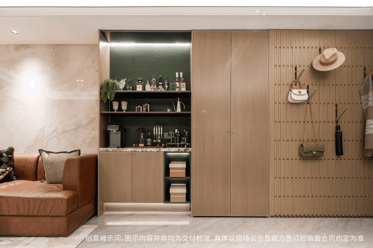 样板间展示上做足了收纳,从玄关进门开始,内藏了一个穿鞋凳的多功能玄关柜、超大容量同步细心考虑了长靴和行李箱存储的鞋柜、餐边柜——绿城将其形象地命名为“早C晚A柜”以及满装的八百库,餐厅边借由飘窗上搭的飘窗柜,新增更充足的收纳空间,细节无敌!
