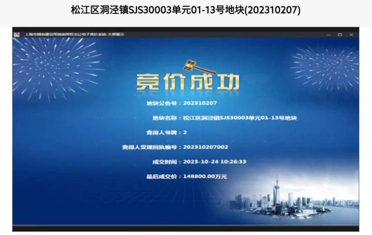 其中,松江区洞泾镇SJS30003单元01-13号地块共吸引3家竞买人参与现场竞价,分别为保利、象屿、招商。最终,经过近20轮现场竞价角逐,由保利收入囊中,成交总价14.88亿元,溢价率7.13%,折合楼板价约24638元/平方米。