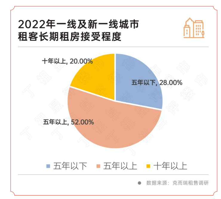 据克而瑞租售调研,根据一线城市的调研结果,5年以上租房的占比达到了52%,还有20%的客户接受10年以上租房。