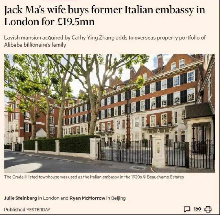 据英国《金融时报》消息,阿里巴巴创始人马云妻子张瑛于去年秋季以1950万英镑(约合1.8亿元人民币)购得伦敦贝尔格莱维亚一处历史名宅。