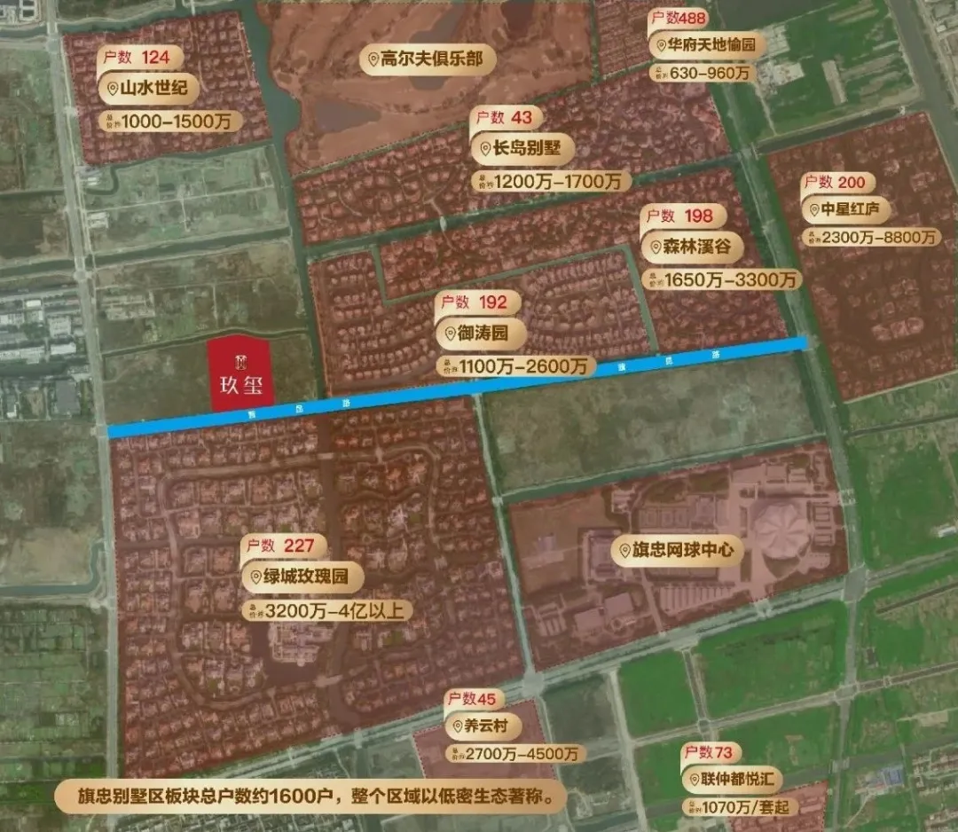 玖玺所在的闵行马桥旗忠别墅区,是上海三大综合容积率低于0.18的国际别墅区之一,千万级甚至上亿的独栋豪宅林立:亚洲十大豪宅之一的绿城玫瑰园、和记黄埔打造的御涛园、庄园大宅中星红庐等都位于此。