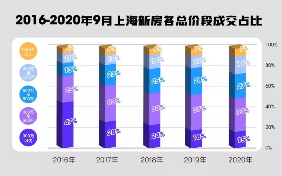 回顾近年来上海楼市成交数据,不难发现,2016年无疑是“刚需为王”的时代,价格决定一切;然而,自2017年起,刚需占比就一路下滑,800-1500万的改善类产品开始出现逐年递增的趋势。
