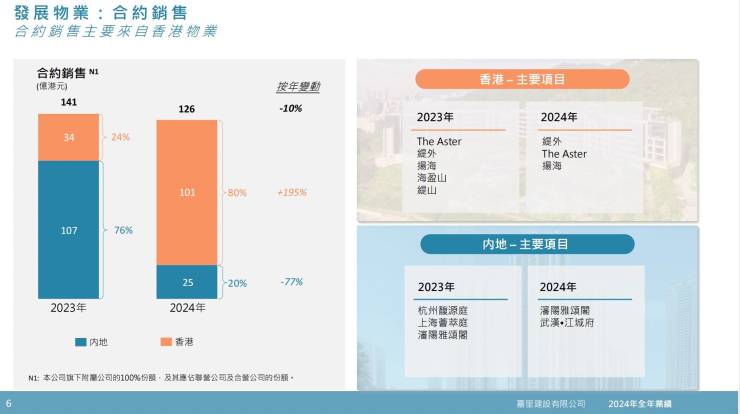 此外,2024年嘉里建设录得合约销售额126.05亿港元(2023年:140.71亿港元),按年跌逾10%,跌幅主要由于内地可销售资源减少,但部分被香港的贡献增加所抵销。