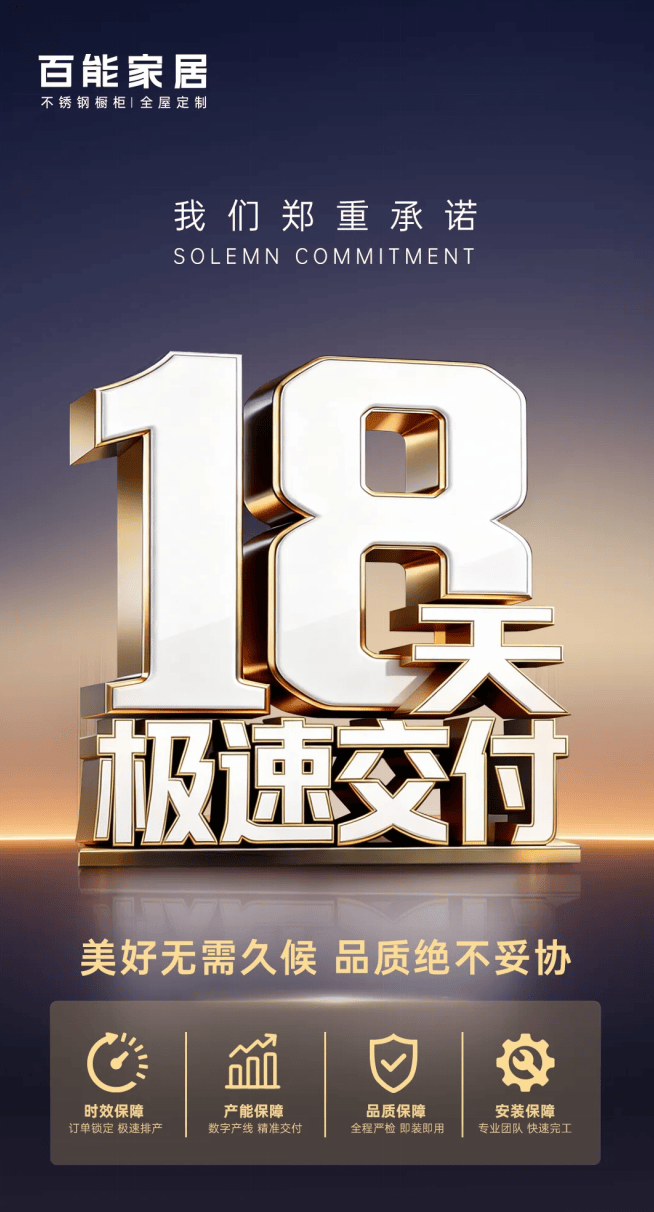 我们懂您的顾虑,更理解您对交付确定感的渴望。为此,百能家居重磅推出 "18天交付"服务,以智能制造重新定义交付标准。从下单到安装,全程透明可控,让装修按计划推进,让新家如期而至。