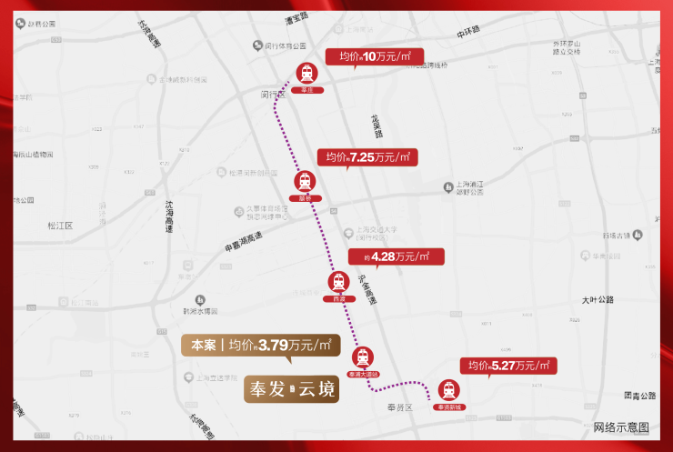 纵览5号线沿线板块新房价格,以奉发云境为原点,南向奉贤新城均价已高达约5.27万/平,北向2站外的西渡也已攀升至约42850元/平(房地联动价),7站之外的颛桥更是达到了约7.25万/平!而“奉发云境”项目,现首开均价仅约37875元/㎡,意味着距闵行仅三站路,价差却将近一半。