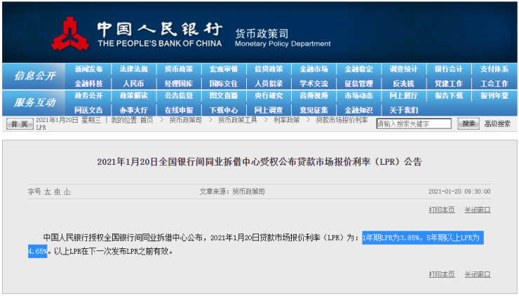 中国人民银行授权全国银行间同业拆借中心公布,2021年1月20日贷款市场报价利率(LPR)为:1年期LPR为3.85%,5年期以上LPR为4.65%。以上LPR在下一次发布LPR之前有效。