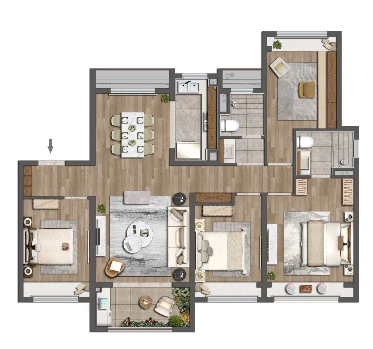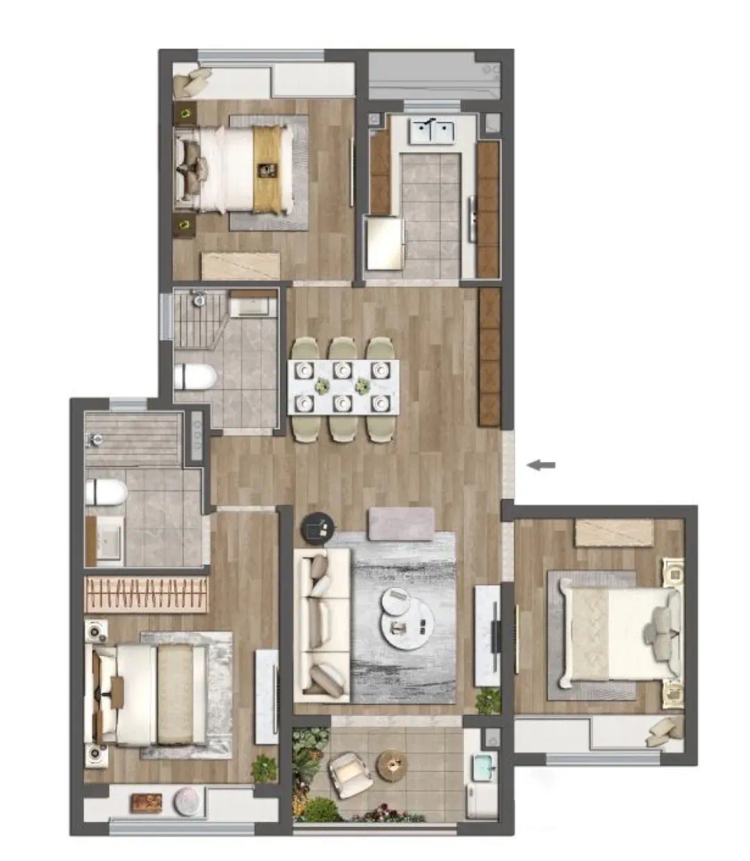 建面约128㎡奢华型4房;全明户型,360°无死角;4开间朝南户型,做到了南北通透;客餐厅一体连接阳台,室内通风更好;动静分离,互不干扰,让居家生活休息娱乐两不误;主卧套房配置,自带衣帽间和卫生间,私密性和舒适度兼具;卫生间干湿分离,既卫生又方便;