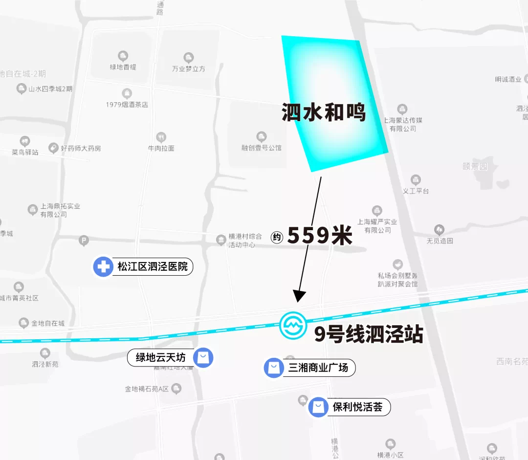 No.3丨交通配套地铁:离项目最近的地铁是9号线泗泾站(步行约620米),步行约10分钟就可到达,非常方便。自驾:项目紧临横港公路,可接驳:泗陈公路、嘉松南路、A9沪青平高速公路、沪松公路、沪渝高速、沈海高速、沪昆高速等上海主干道,可快速到达上海各各个热门商圈,尽享便捷出行的悠享生活。