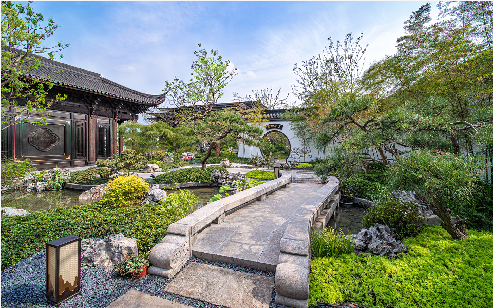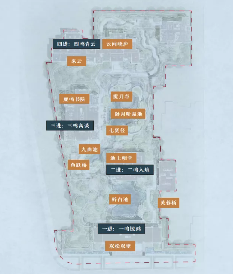 泗水和鸣景观采用中式园林风格,以“醉白池”为蓝本,采用“一轴两廊双环”设计,构建有:鸿入境,高谈青云,四进礼制;三池三堂,双门双桥,曲径通幽,十二景和鸣的景观体系。
