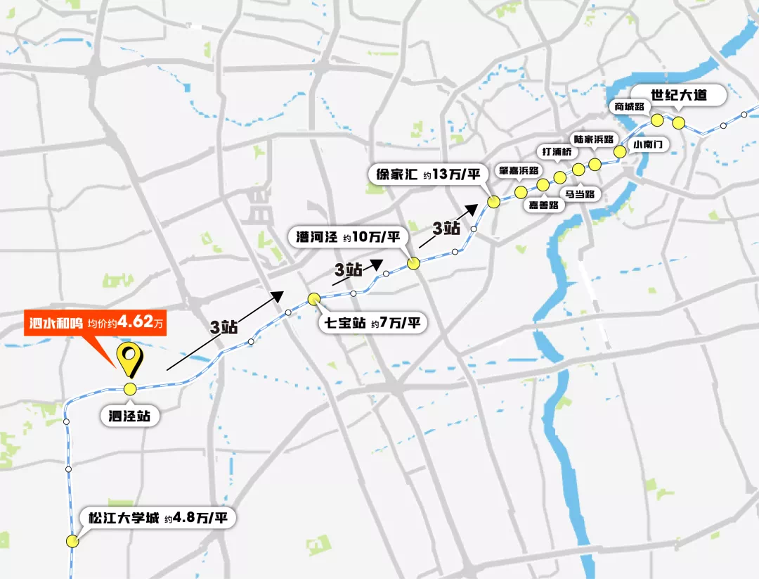 不管有没有沪牌,但上班高峰期去市区上海,不可否认,地铁出行是最方便、较快捷、最省事、最重要的通勤方式。沿着9号线你看看这巨大的房价剪刀差,以泗泾站为原点:仅3站地铁的七宝,房价均价约7万/㎡;仅6站地铁的漕河泾,新房已到10万/㎡;仅9站地铁的徐家汇,房价均价约13万/㎡;而泗泾新房均价才约4.5万/㎡,松江泗泾,凭借黄金9号线迅捷通达沪上先进CBD群,同时巨大的价差,庞大的外溢需求,价格才徐家汇三分之一左右,比起仅6站的漕河泾,泗泾房价不到其一半,泗泾板块超高性价比毋容置疑!