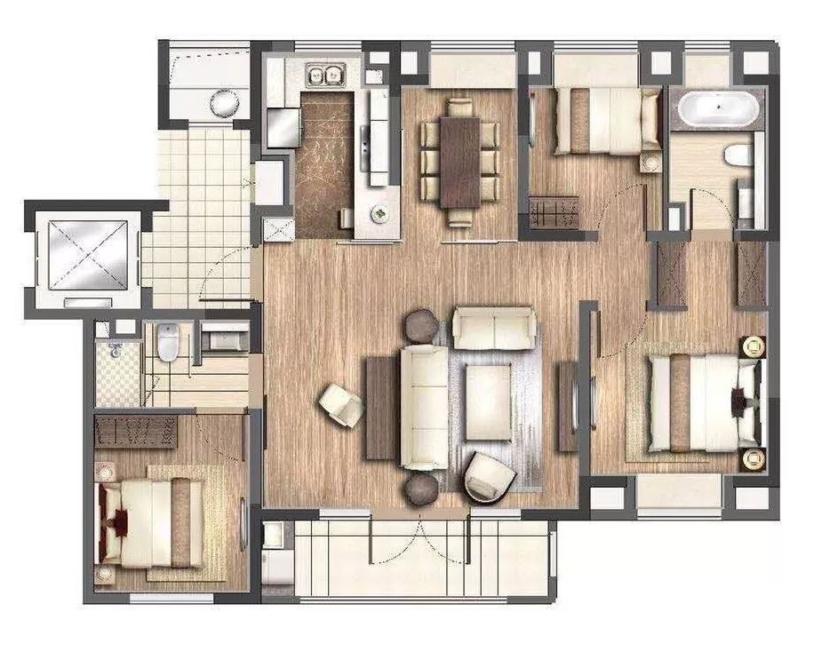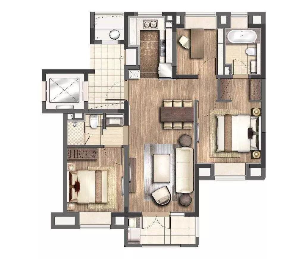 格局与95平大致相同,只是空间上更加阔绰大气,餐客厅以及紧连的景观阳台尺度更大,舒适感倍增。