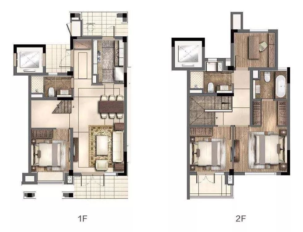 餐客厅以及厨房与卧室动静分区,留有玄关,舒适度高;一楼卧室可用作老人房,不必上下爬楼,二层规划为两个卧室,带有北向观景露台。