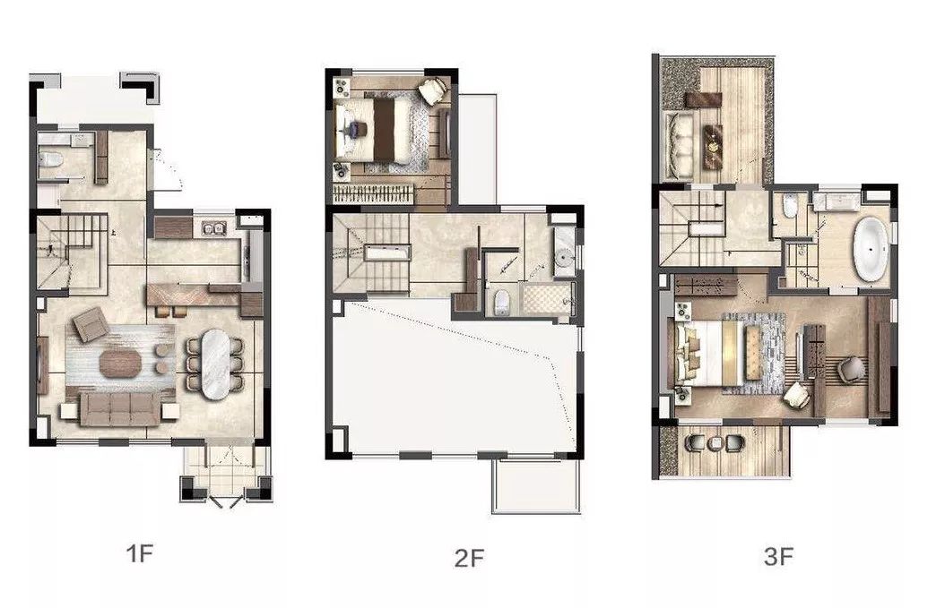 主要分为三层,卧室静区与客餐厅动区完全分离;约6.6米大面宽客厅二层挑空,全南大尺度,三层为主卧套房。