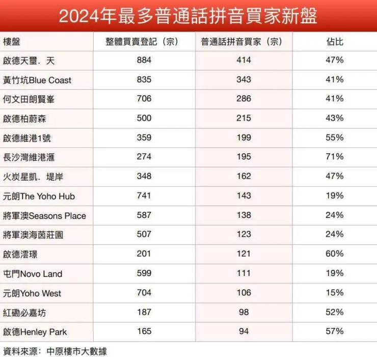 选取去年首15个(见表)最多普通话拼音买家新盘,新地(00016.HK)有四个新盘上榜,包括启德天玺·天、元朗The Yoho Hub、屯门Novo Land及天水围Yoho West,合共录得774宗该类客入市,占售出单位2928伙的26%。其中天玺·天售出884伙,近一半买家、即414宗属该类客,是去年最多【国语客】追捧新盘。其次是黄竹坑站上盖港岛南岸Blue Coast,录343宗;之后是何文田朗贤峯,及启德柏蔚森,分别有286及215宗。