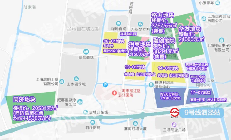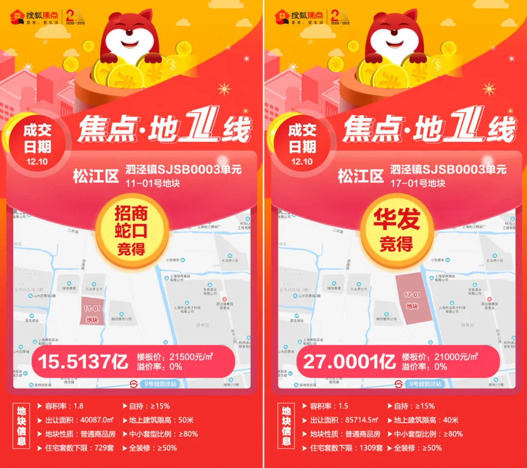 2019年12月10日,招商和华发各自以底价摘下泗泾一幅纯宅地。其中招商以15.5137亿元的总价竞得松江区泗泾镇SJSB0003单元11-01号地块,成交楼板价21500元/㎡。华发以27.0001亿元的总价竞得松江区泗泾镇SJSB0003单元17-01号地块,成交楼板价21000元/㎡。